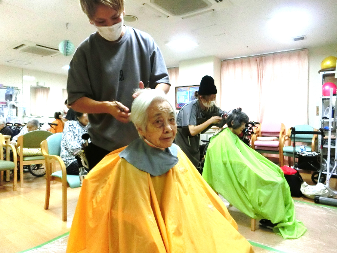 2カ月ごとに、訪問理美容の方が来られ、利用者様のご要望に合わせてカット・カラーリング・お顔そりを行っていただいています。