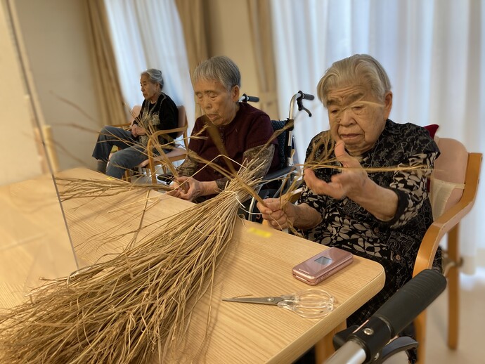 門松は職員が竹林へ竹を取りに行き、縄は藁を使って利用者様に編んでいただきました。