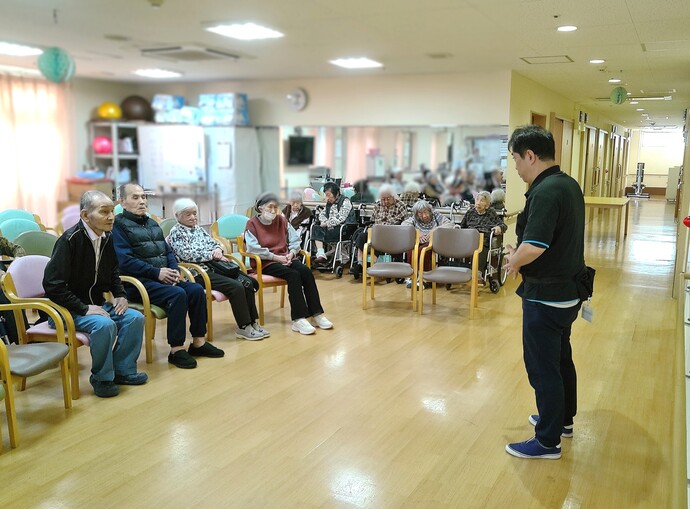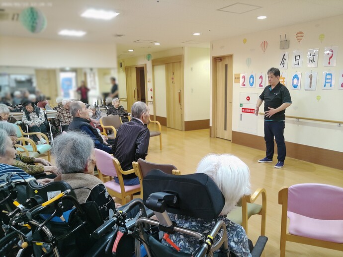職員の掛け声に合わせて「ワンツー、ワンツー!」と、皆さまで一緒に体を動かします💪🏻