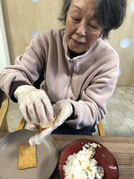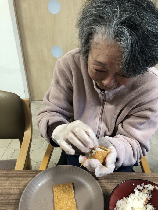 利用者様からは「おいなりさんにご飯を入れるのは久しぶり☺️」と、懐かしむお声も聞かれ、たくさんご用意したいなり寿司を笑顔で召し上がってくださいました。