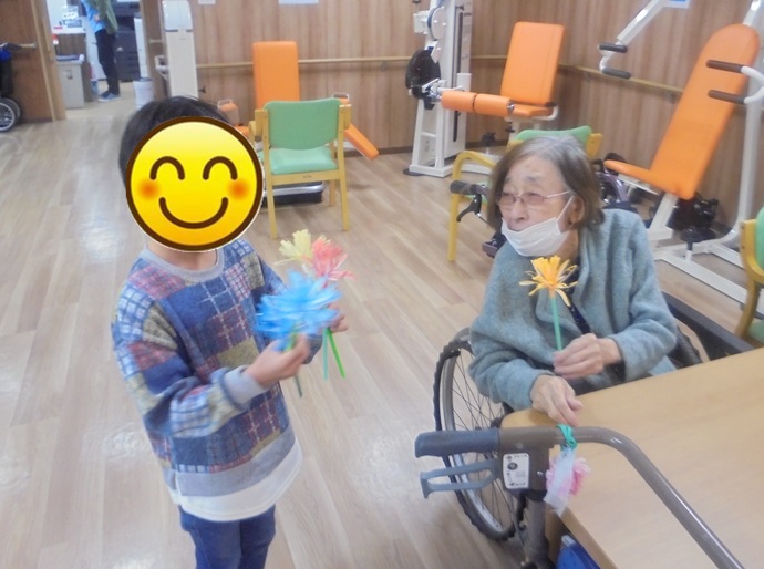 この日のために折り紙で作ってきてくれたかわいらしいお花を、入居者の皆さまお一人おひとりに手渡ししてくれました。