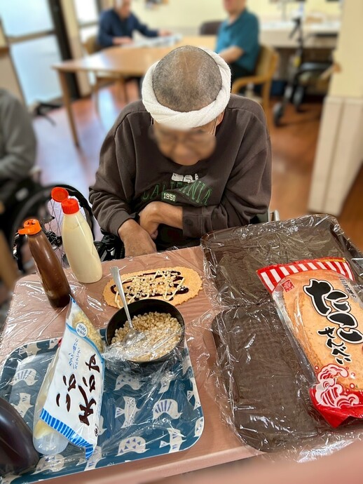 おやつにはたこせん作りを行い、利用者様がニコニコと楽しそうに作ってくださいました。