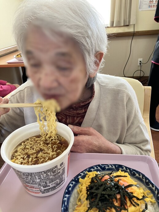 今回のレクリエーションでは、ちらし寿司と、たくさんの種類のカップ麺の中からお好きなものを選んでいただきました。