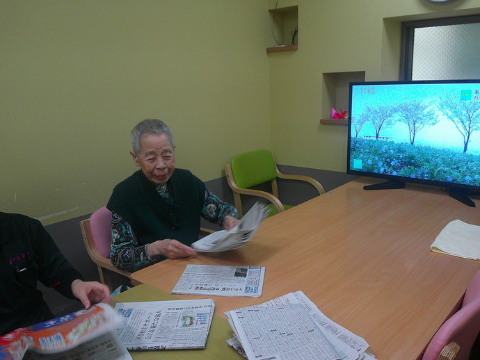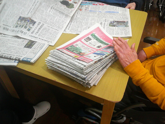 利用者様も手先の運動になると、積極的に新聞折りに参加してくださっています。