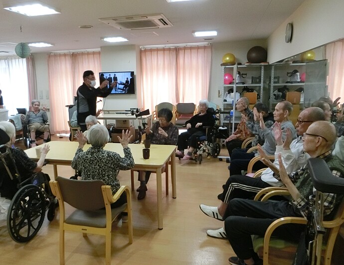 ナチュラル東大阪では、利用者様が集まって笑顔で体操に取り組まれました。